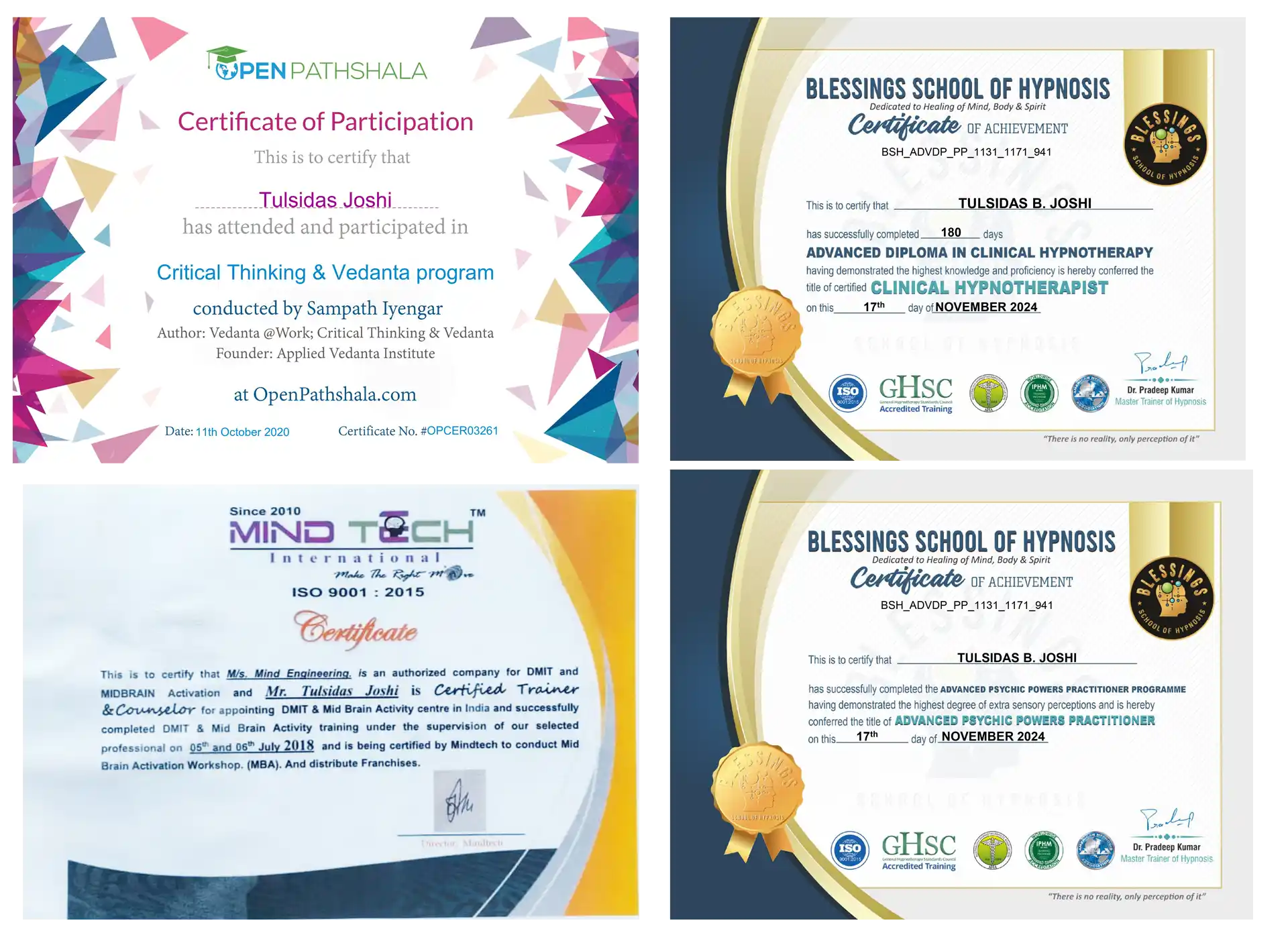 With a passion for personal growth and healing, Mr. Tulsidas Joshi has successfully earned certifications from some of the most respected institutions in the field. These include the "Blessings School of Hypnosis," where he specialized in advanced hypnosis techniques for transformative healing. Additionally, he completed an extensive program at "Mind Tech," specializing in mental wellness strategies and techniques. Mr Tulsidas Joshi is also a proud participant of "PenPathshala" for Critical Thinking & Vedanta Program, furthering expertise in holistic approaches to mental and emotional health. These achievements reflect his commitment to helping clients achieve balance, growth, and healing in their lives.